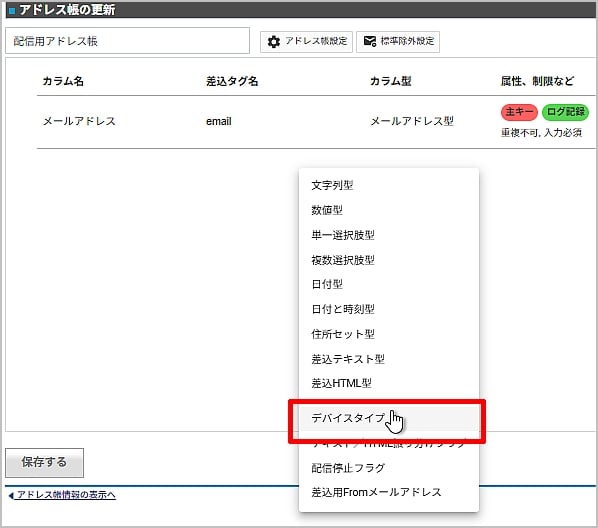 3.カラム型の一覧が表示されるので「デバイスタイプ」カラムの型をクリック