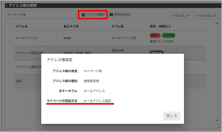 アドレス帳情報の「編集する」ボタンからアドレス帳更新ページを開き、画面上部にある「アドレス帳設定」より確認できます。